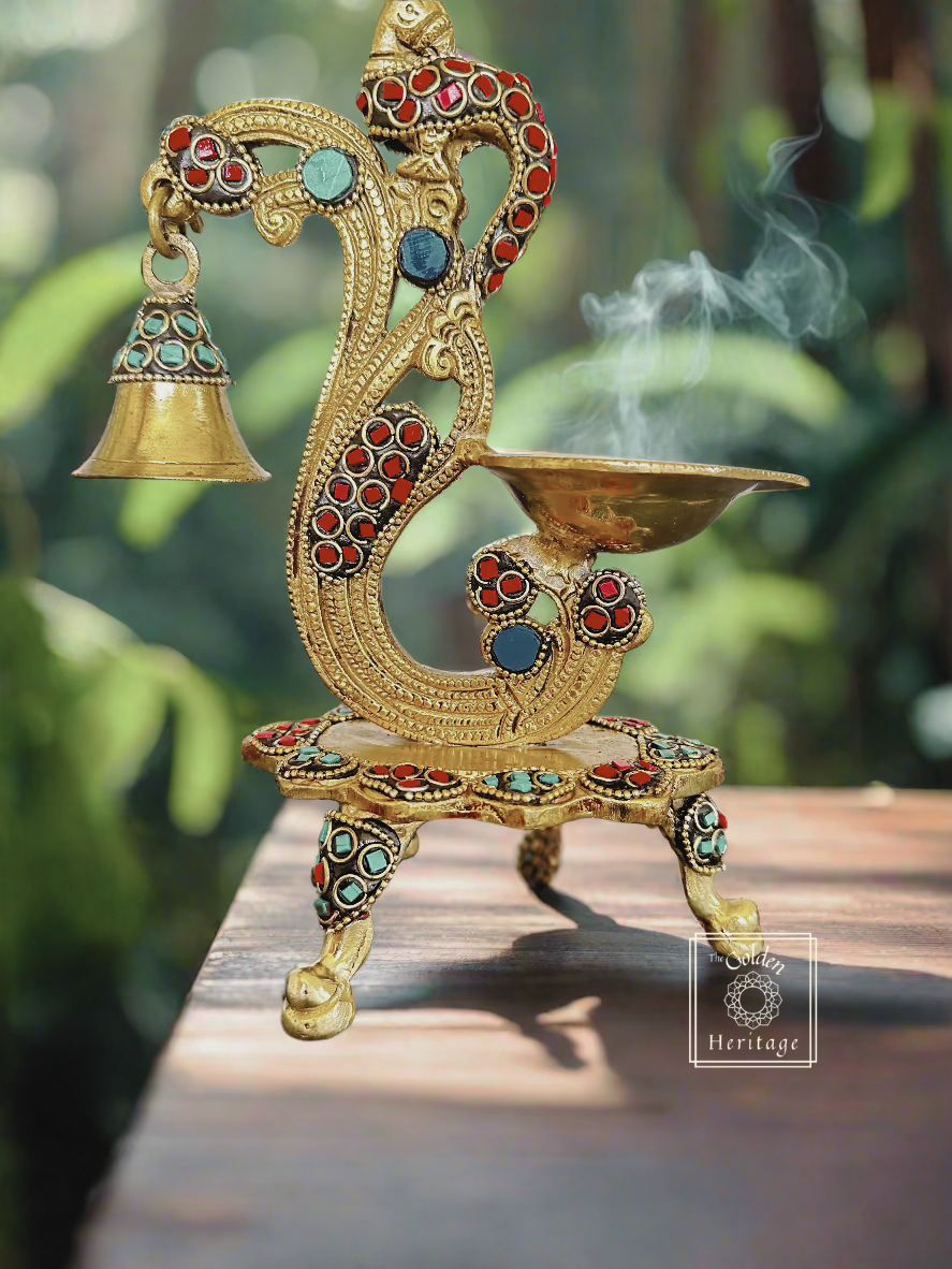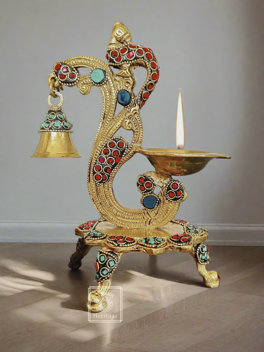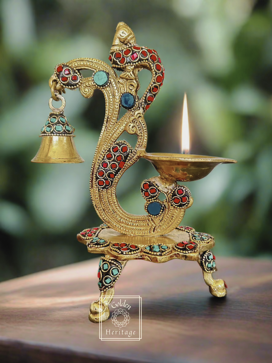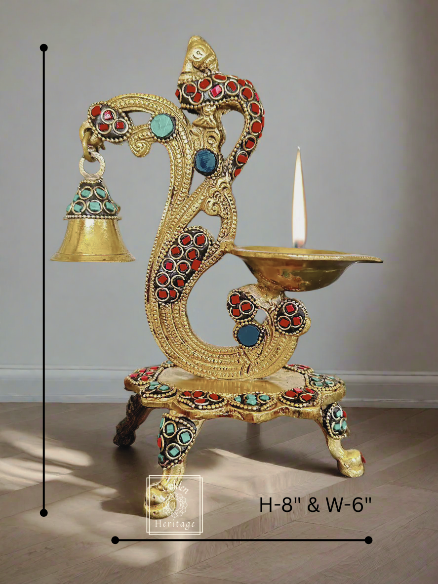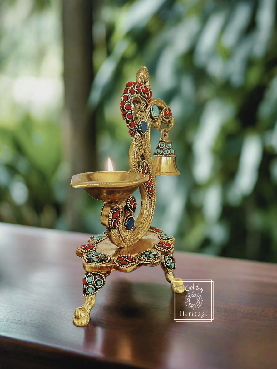 Peacock Diya with Stone work, A Peacock Lamp with a bell, which is perfect for pooja ceremonies, home décor, or as a thoughtful housewarming return gift.